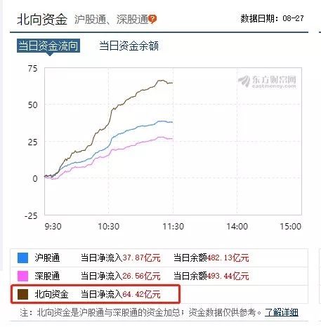 今日上午北上资金大举买入近65亿元,其中沪股通净买入37.87亿元,深股通净买入26.56亿元。