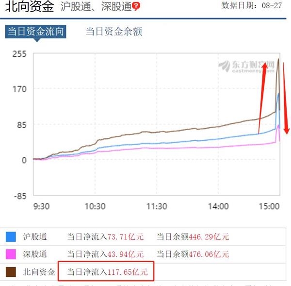 但随后却泼下一盆冷水:收盘数据显示,北上资金最终净流入额为117亿,这意味着,在尾盘有120多亿资金进行了卖出。