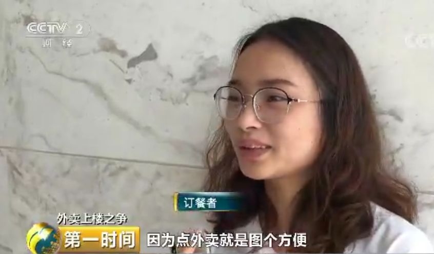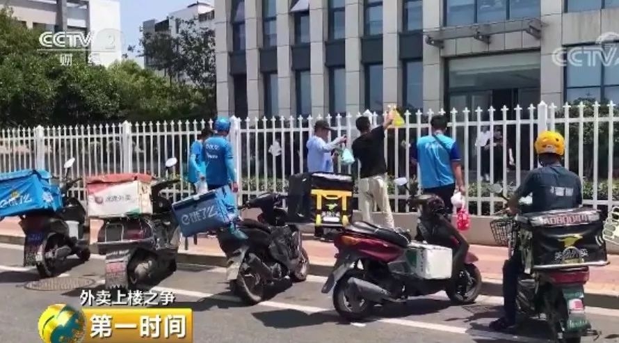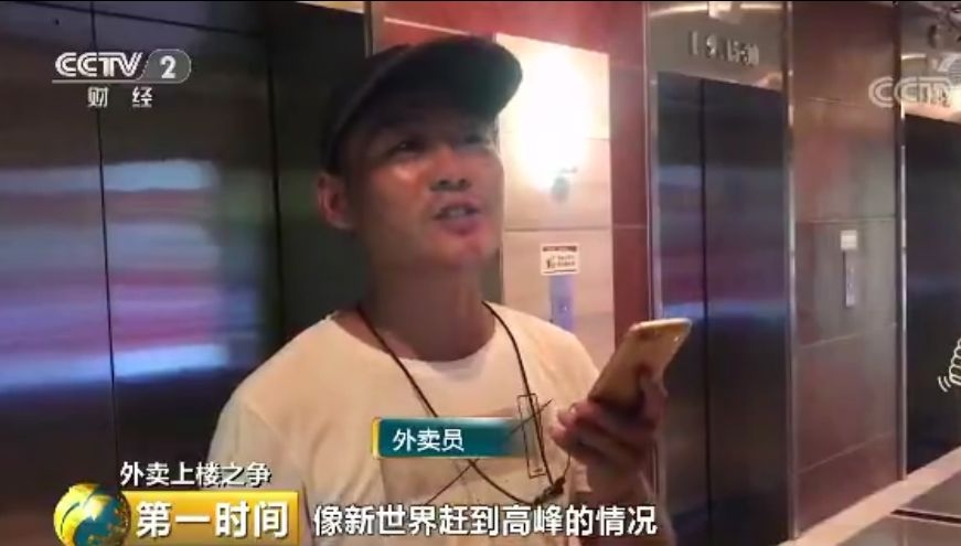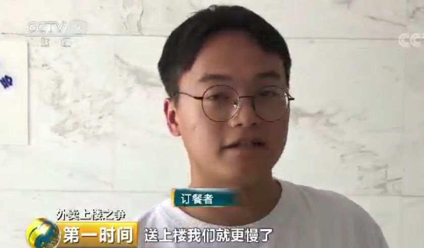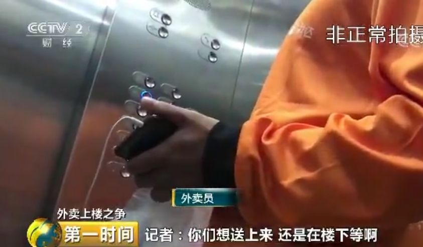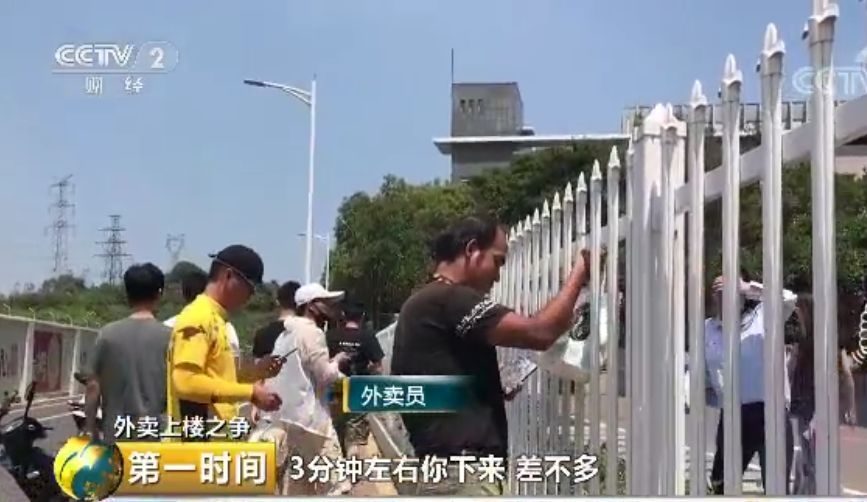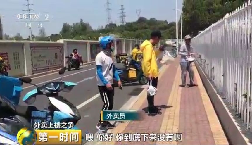 记者:你们想送上来,还是在楼下等啊?外卖员:我们看客人需要,要不要送上去。记者:那你觉得是送上去方便,还是在外面等方便?外卖员:肯定是外面等方便,因为我们还要爬楼,还要等时间。