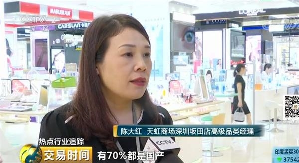 天虹商场深圳坂田店高级品类经理陈大红:我们一共有14个化妆品品牌,70%都是国产,有30%是进口化妆品。今年,国产化妆品的走势是在往上走,比以往来说,每个品牌都同比增长10%到20%。