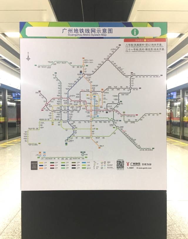 近日,细心的乘客发现个别地铁车站陆续换上了新的线网图。新的线网图可以清晰地看到:21号线(员村—镇龙西)和8号线北延段线路信息已更新进去。其中21号线确定今年开通,这也就意味着广州地铁即将突破500公里。