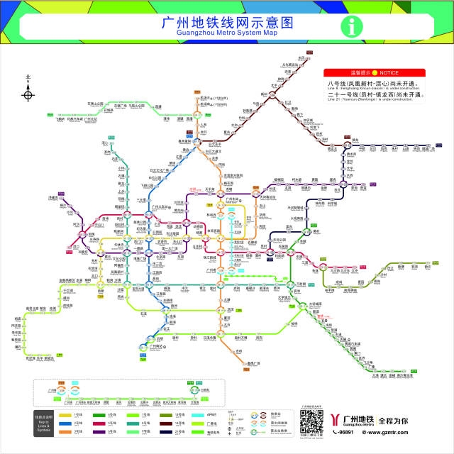 12.2019年,广州地铁线路图又加入21号线(员村—镇龙西)和8号线北延段线路信息。其中,21号线确定年内开通,广州地铁总里程将突破500公里。