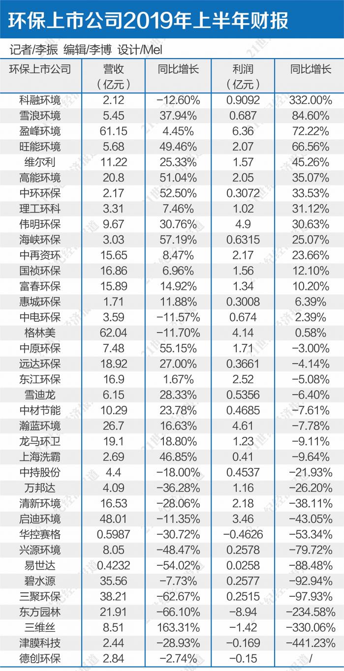 21世纪经济报道记者统计发现,截至8月28日,环保上市公司不少已经发布了其2019年中报。