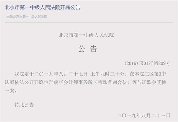 北京法院审判信息网开庭公告显示,瑞华不服证监会对*ST华泽一案的行政处罚,把证监会告了,该案于8月27日在北京市第一中级人民法院开庭审理。