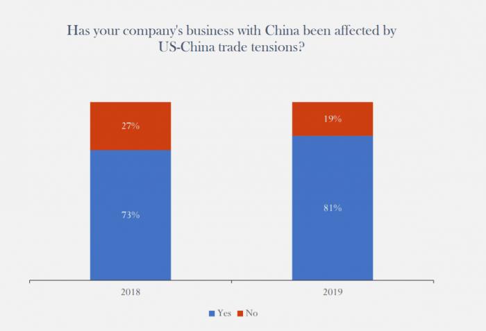尽管如此,自去年以来不断升级的贸易摩擦确实对在华美国企业的经营产生了负面影响。调查显示,81%的受访企业表示中美贸易紧张局势对其在华经营产生了影响,这一比例比去年上升了8个百分点。