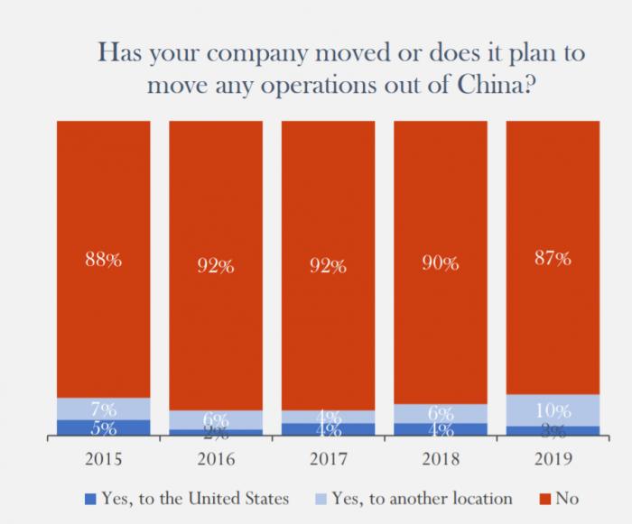 此外,87%的受访企业表示既没有搬迁也没有将业务转到中国以外的计划,去年调查时持有这一观点的企业占比为90%。