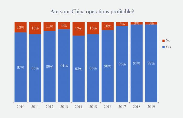 考虑到其作为收入增长驱动力的相对重要性,大多数受访企业仍然将中国市场视为优先考虑的市场。调查显示,中国业务利润率高于整体业务利润率的受访企业占比从去年的38%跃升至2019年的46%。