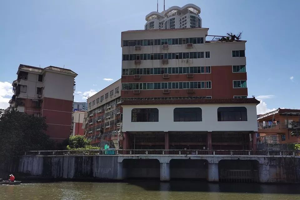 垮塌的单身公寓紧邻深圳河支流布吉河。记者在布吉河西岸看到,东侧的和平新居楼房下方有一道水闸,整排房屋均是跨暗渠而建。