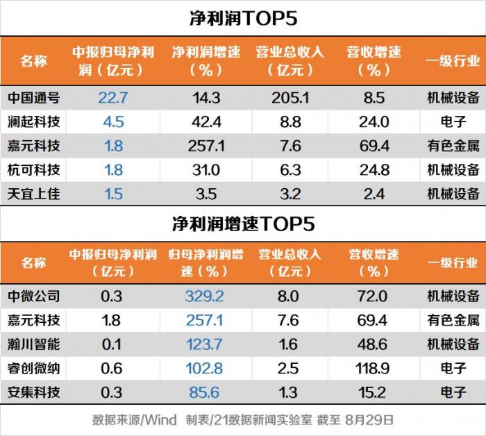 9家企业增速超过50%,4家超过100%!中微公司(688012.SH)最高,为329.2%,随后是嘉元科技(688388.SH)、瀚川智能(688022.SH)、睿创微纳(688002.SH),分别为257.1%、123.7%、102.8%。有10家上半年归母净利润超过1亿元,占比接近四成!