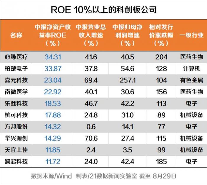 从净资产收益率ROE来看,2019年中报显示,在28家公司中,10家公司的ROE超过10%,4家达到20%以上,ROE最高的是心脉医疗(688016.SH),达到了34.31%!