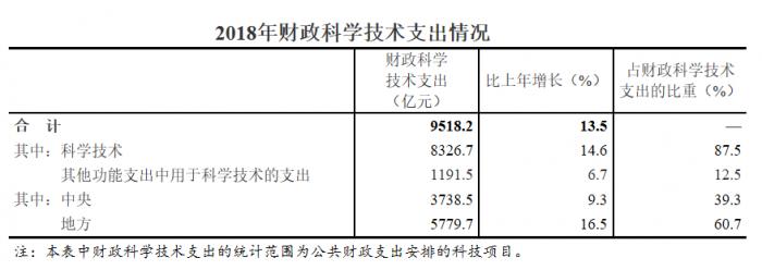 2018年,国家财政科学技术支出9518.2亿元,比上年增加1134.6亿元,增长13.5%;财政科学技术支出与当年国家财政支出之比为4.31%,比上年提高0.18个百分点。其中,中央财政科学技术支出3738.5亿元,增长9.3%,占财政科学技术支出的比重为39.3%;地方财政科学技术支出5779.7亿元,增长16.5%,占比为60.7%。