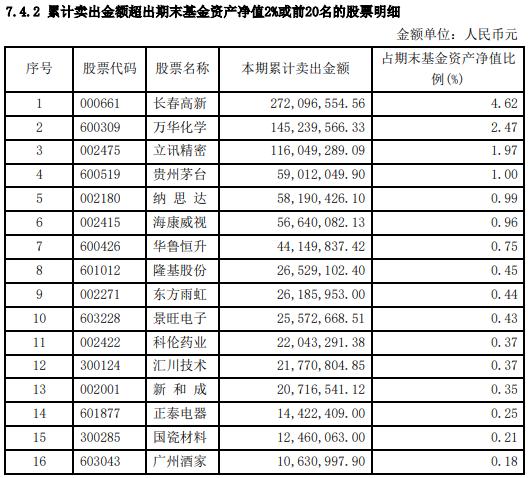 中报显示,累计卖出较多的股票有长春高新、万华化学、立讯精密、贵州茅台、纳思达、海康威视等。