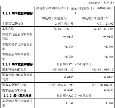 而6月底,睿远成长价值混合A基金份额净值为0.9865元,上半年,该类基金份额净值增长率为-1.35%,同期业绩比较基准收益率为-0.04%;截至报告期末睿远成长价值混合C基金份额净值为0.9854元,本报告期内,该类基金份额净值增长率为-1.46%,同期业绩比较基准收益率为-0.04%。