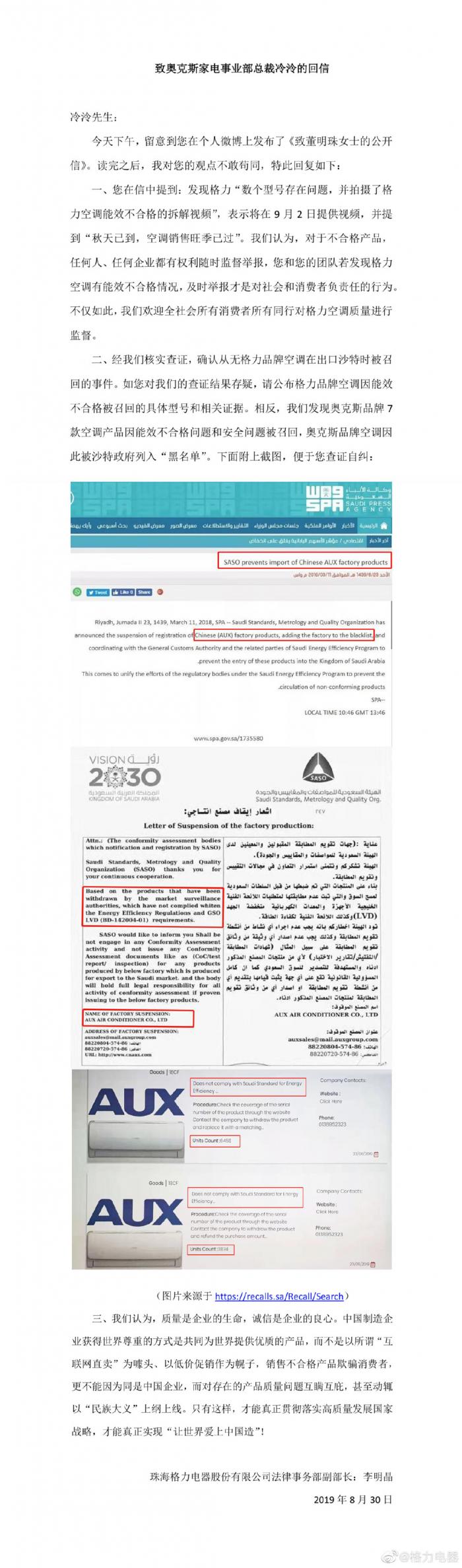 8月30日深夜,格力电器官方微博迅速回应了冷泠的公开信。