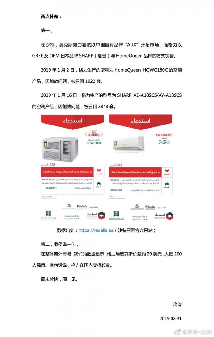 面对格力电器的反击, 8月31日凌晨1点48分,冷凌再度做出“两点补充”,指责格力电器以其他品牌形式在沙特销售,并且海外价格比国内更便宜。