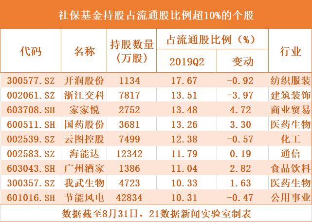 社保基金重仓持股占单个股票流通股比例超10%有9只,比例最高是开润股份(300577.SZ),占该股流通股比例的17.67%,较一季度末减持了58.15万股。而家家悦(603708.SH)则增持了1375.93万股,股份占比从一季度末的8.76%上升至13.48%。