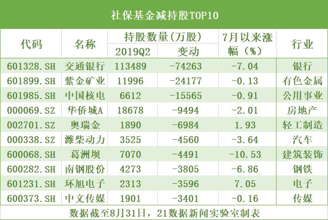 个股方面,社保基金减持最多的非交通银行莫属。紫金矿业(601899.SH)、中国核电(601985.SH)的减持数量也超过1亿股。