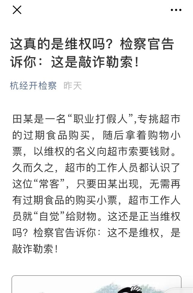 8月29日,杭州经开区检察院官方微信发布了一则案件通报,通报显示,田某曾经是一名食品企业处理纠纷投诉的工作人员,2016年起,他开始了其“职业打假”之路,每天的工作就是逛超市,寻找超市售卖的过期食品。一经发现立即下单购买,随后便拿着购物小票,要求超市退款并给予一定的补偿款,少则数百,多则上千。而超市一方,一般则会为了息事宁人而满足田某的要求。当然,也有超市怀疑是田某夹带的过期食品,而不予赔偿,后由工商部门出面协调,甚至还有闹到法院诉讼的情况,给超市带来了巨大困扰,甚至影响了正常的经营活动。