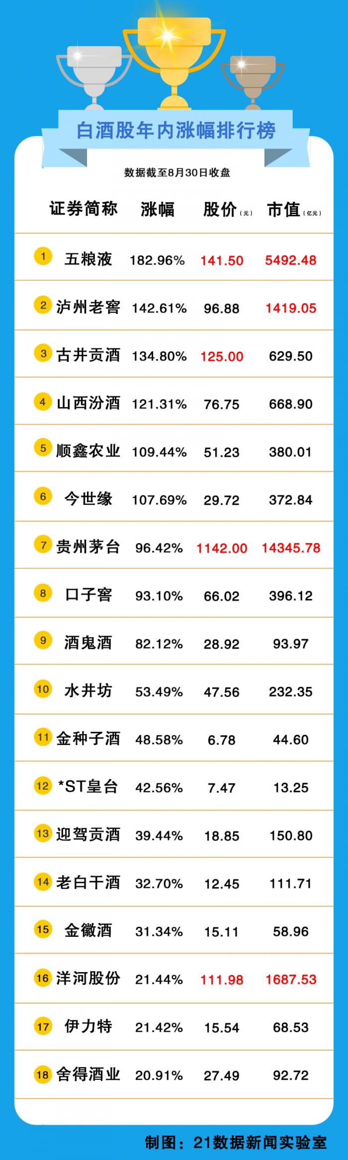 板块内个股实现了全线上涨,其中6只个股股价翻番,分别为五粮液、泸州老窖、古井贡酒、山西汾酒、顺鑫农业、今世缘。行业龙头股贵州茅台紧随其后,涨幅已达94.42%。即便是板块内涨势最弱的个股舍得酒业,涨幅也已达到20.91%,跑赢同期上证指数涨幅。