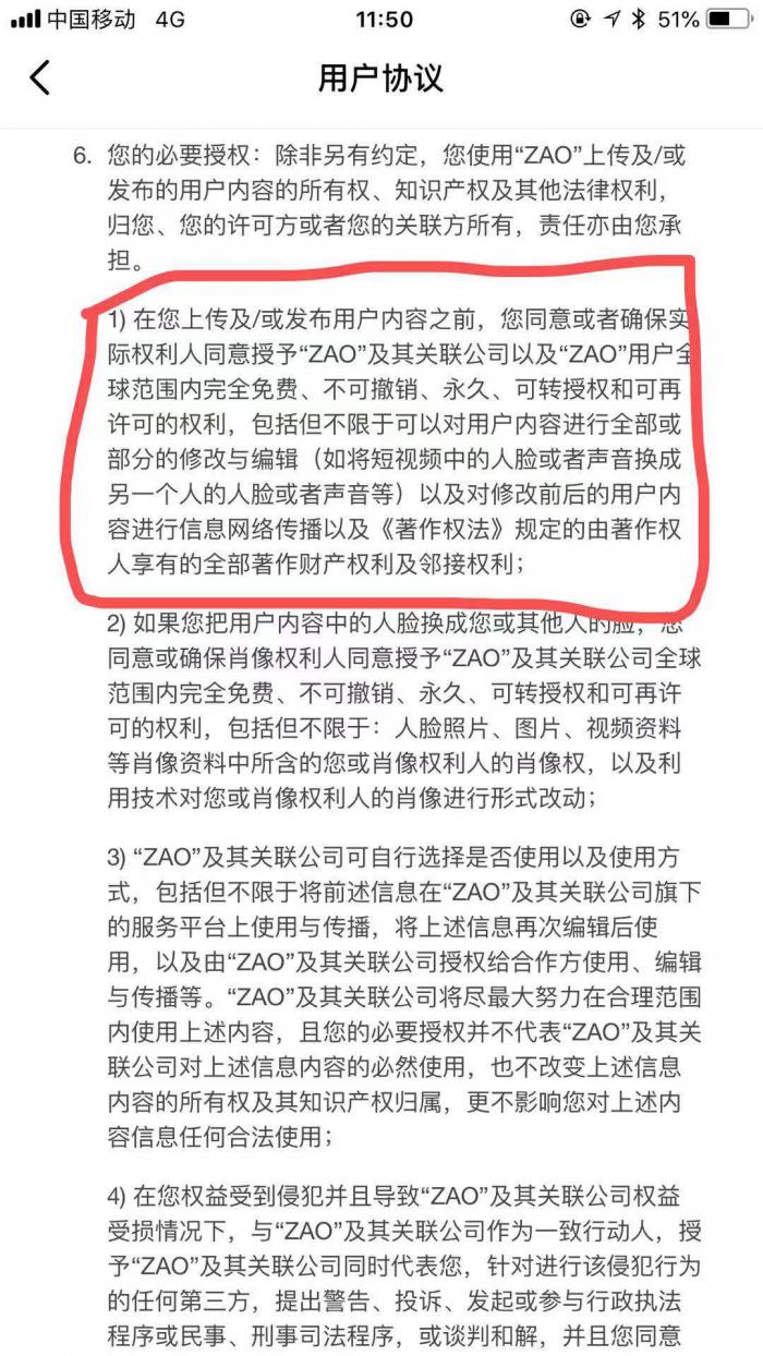 而对于用户上传的内容,ZAO提出,应对使用“ZAO”发布的内容的真实性、合法性负责。您在发布信息内容时,如需获得该信息内容权利人或任何有权第三方(包括但不限于肖像权权利人以及其他网络平台等)的事先授权或批准的,应事先获得该等授权或批准;一旦您发布某项信息内容,将被视为您已事先获得该等授权或批准(如有)。