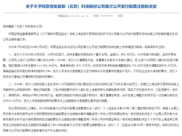 首例!交易所过审证监会不予注册:恒安嘉新科创板临门一脚被拦