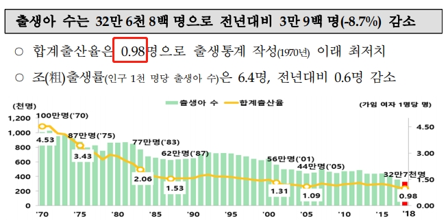 8月28日,韩国统计局发布数据显示,2018年韩国总生育率为0.98,低于上一年的1.05。