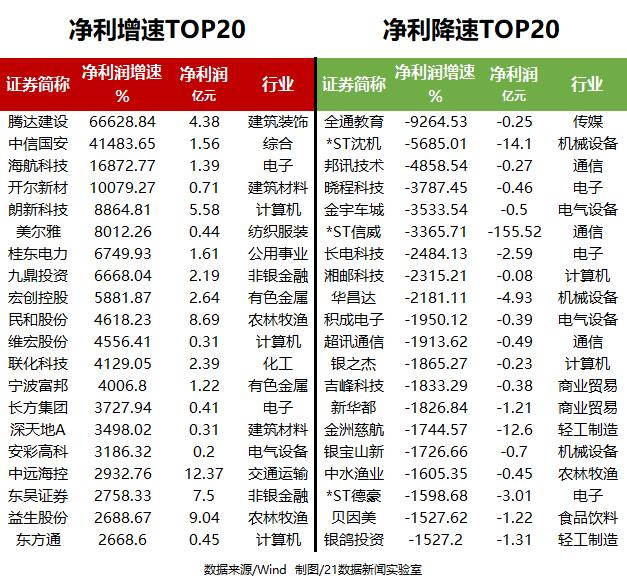 净利润增速方面,40家公司归母净利润同比增长超过十倍。其中腾达建设(600512.SH)、海航科技(600751.SH)、开尔新材(300234.SZ)等4家公司超过百倍。