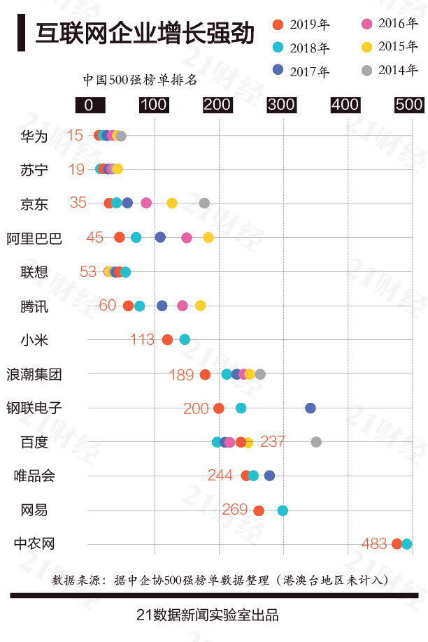 不仅数量逐渐增多,营收增速亦颇为亮眼。大部分互联网企业2019年名次(以2018年营收排名)上升明显,小米、阿里2018年营收增速高达50%,腾讯、钢联电子、京东、浪潮集团等增速也在25%以上,增长势头迅猛。