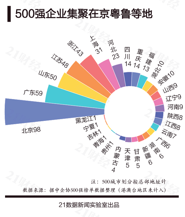 21数据新闻实验室梳理榜单企业总部所在地发现,短期内500强企业头部格局难以撼动,多集聚在北京、广东、山东、江苏、浙江等经济发达地区。