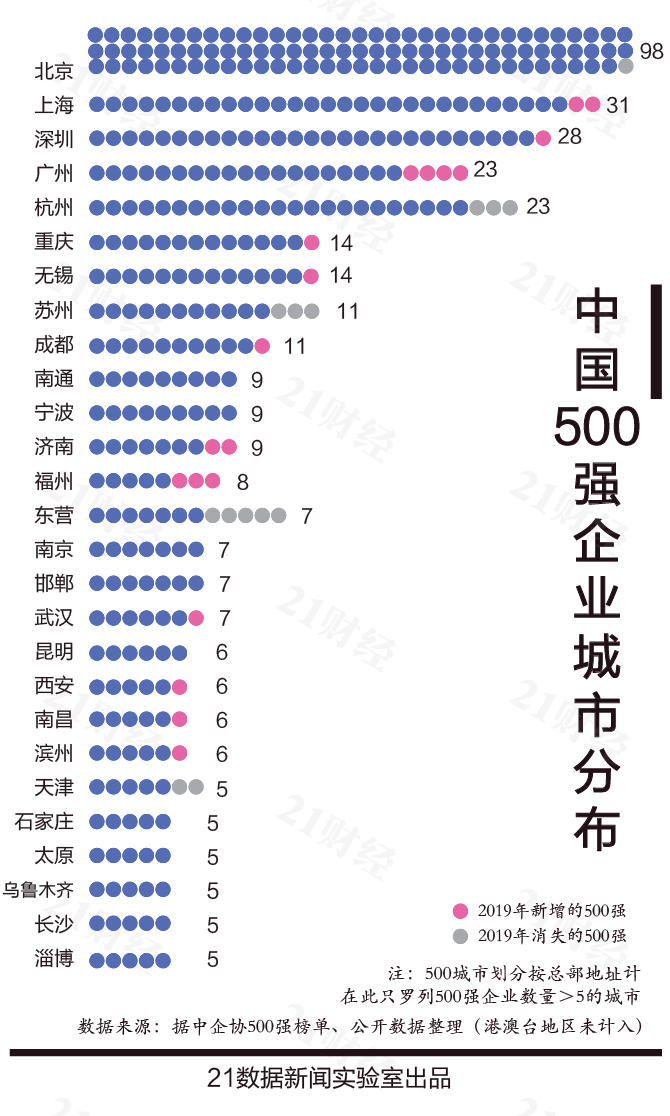 相反,天津、苏州、东营等经济出现减速的城市500强企业数量相应减少,尤其东营更是一次性减少5家。