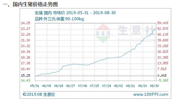来自生意社的数据显示,8月国内外三元生猪价格大幅上涨,8月1日初均价18.43元/公斤,8月30日均价23.43元/公斤,大幅上涨27.13%。