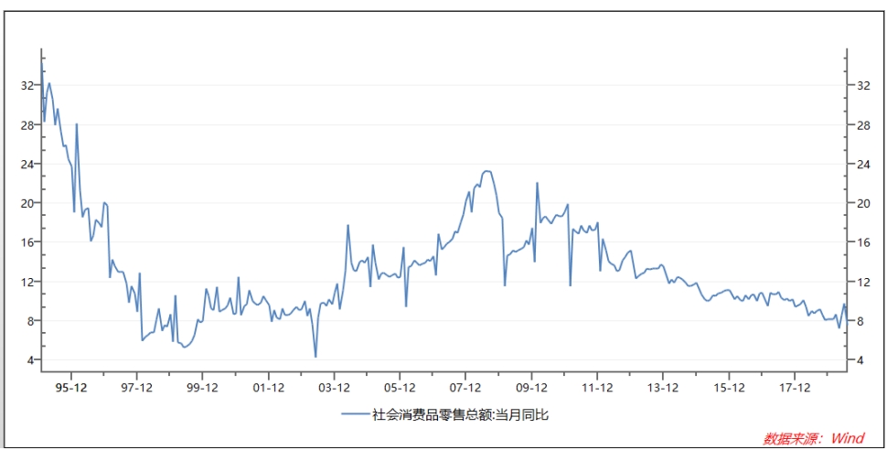 2018年,我国居民的杠杆率超过了50%,达到了53.2%。在这个时候,市场会普遍预期,全社会的消费潜力可能会出现下降。的确,近期的全社会消费品零售总额也是波澜不惊。