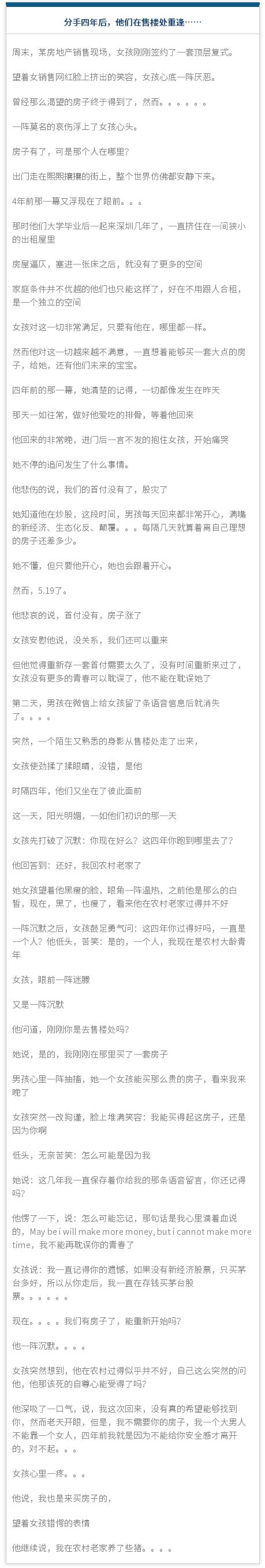 本周末,资金公号“资管店小二”发了一则题为《分手四年后,他们在售楼处重逢》的文章,故事的主要内容是:男主曾经炒股失败,把婚房首付给赔得精光,不想耽误女主,选择分手。分手之后,男的回农村养猪大赚;女主则挣钱买茅台股票亦收获颇丰。四年之后,他们在售楼处重逢,两人不约而同地在同一楼盘买房子(后附全文)。