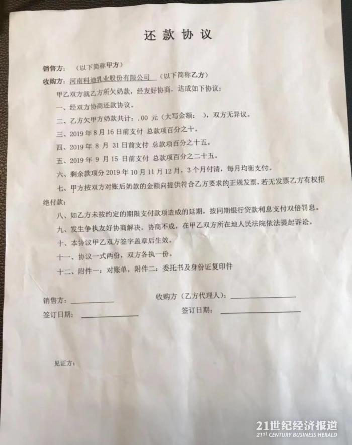 21世纪经济报道记者此前获得的还款协议显示,双方约定科迪乳业在8月16日前向奶农支付所欠奶款总数的10%,在8月31日前支付总款项的15%,在9月15日前支付总款项的25%。剩余款项分2019年10月-12月3个月付清,每月均衡支付。