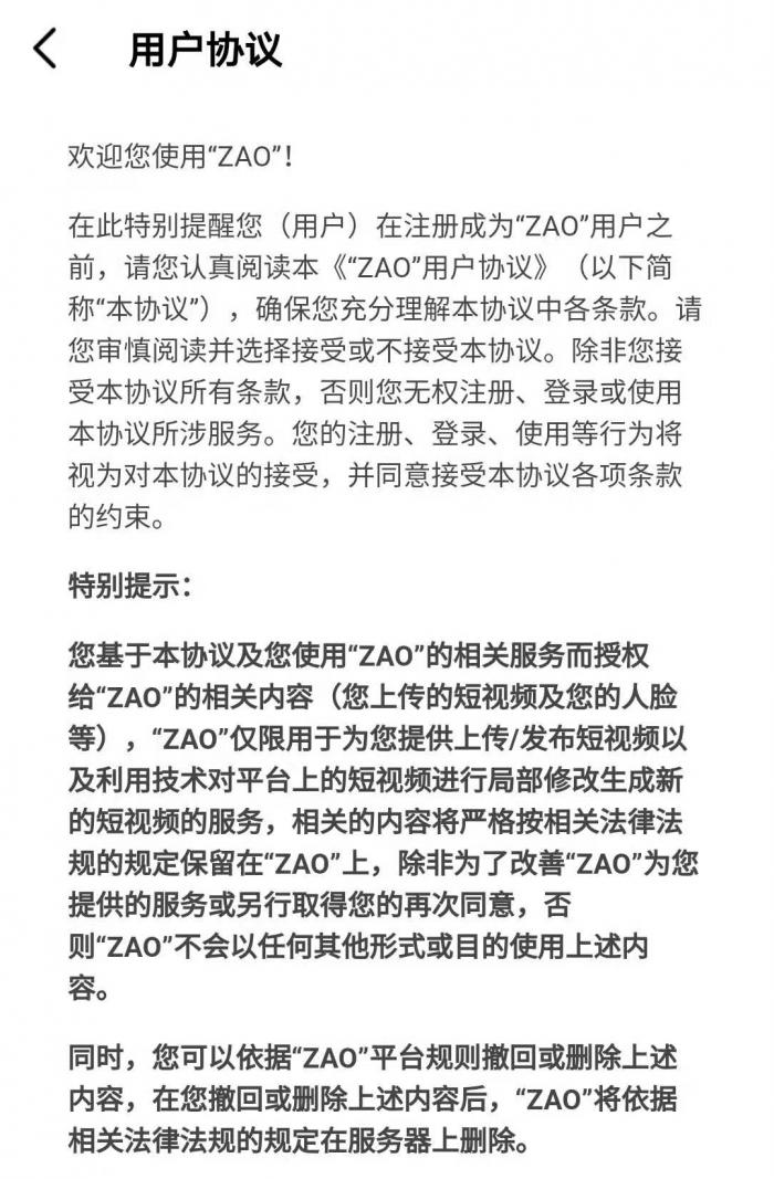 9月1日,“ZAO”修改了部分争议内容,并增加一段“特别提示”称,用户授权内容“仅限用于为您提供上传/发布短视频以及利用技术对平台上的短视频进行局部修改生成新的短视频的服务,相关的内容将严格按相关法律法规的规定保留在“ZAO”上,除非为了改善“ZAO”为您提供的服务或另行取得您的再次同意,否则“ZAO”不会以任何其他形式或目的使用上述内容”。