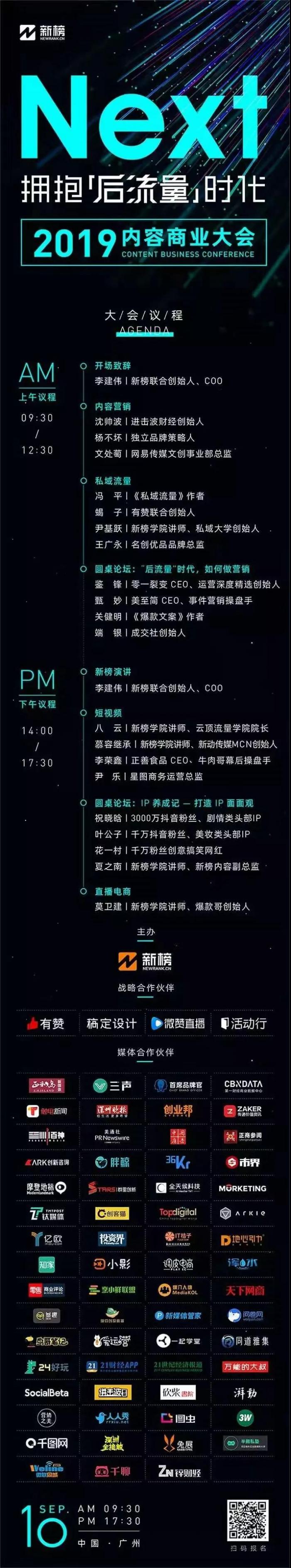 9月10日,新榜将在广州举办2019内容商业大会——拥抱“后流量”时代,携业内顶级嘉宾为你一一揭秘: