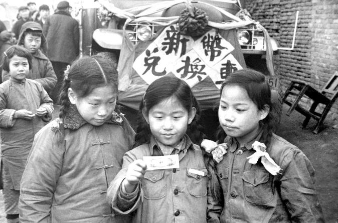 1955年2月21日,国务院发布关于发行第二套人民币和收回第一套人民币的命令,这是天津郊区农村的孩子们在观看兑换来的新人民币。(资料图片)