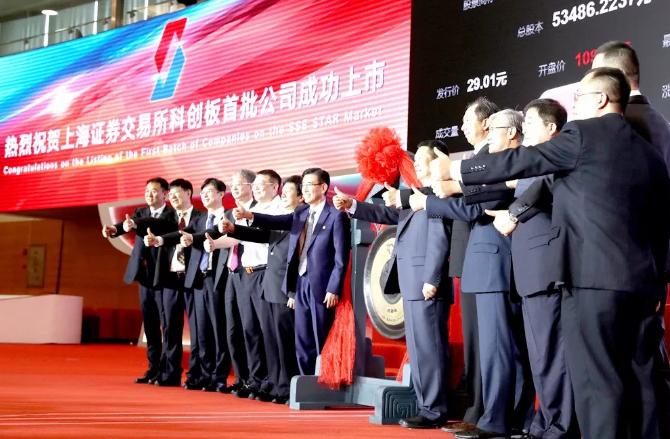 2019年7月22日上午9点30分许,伴随开市锣声的响起,首批25只科创板股票在上海证券交易所上市交易,科创板正式开市,这是上市企业代表在台上合影。新华社记者 方喆 摄