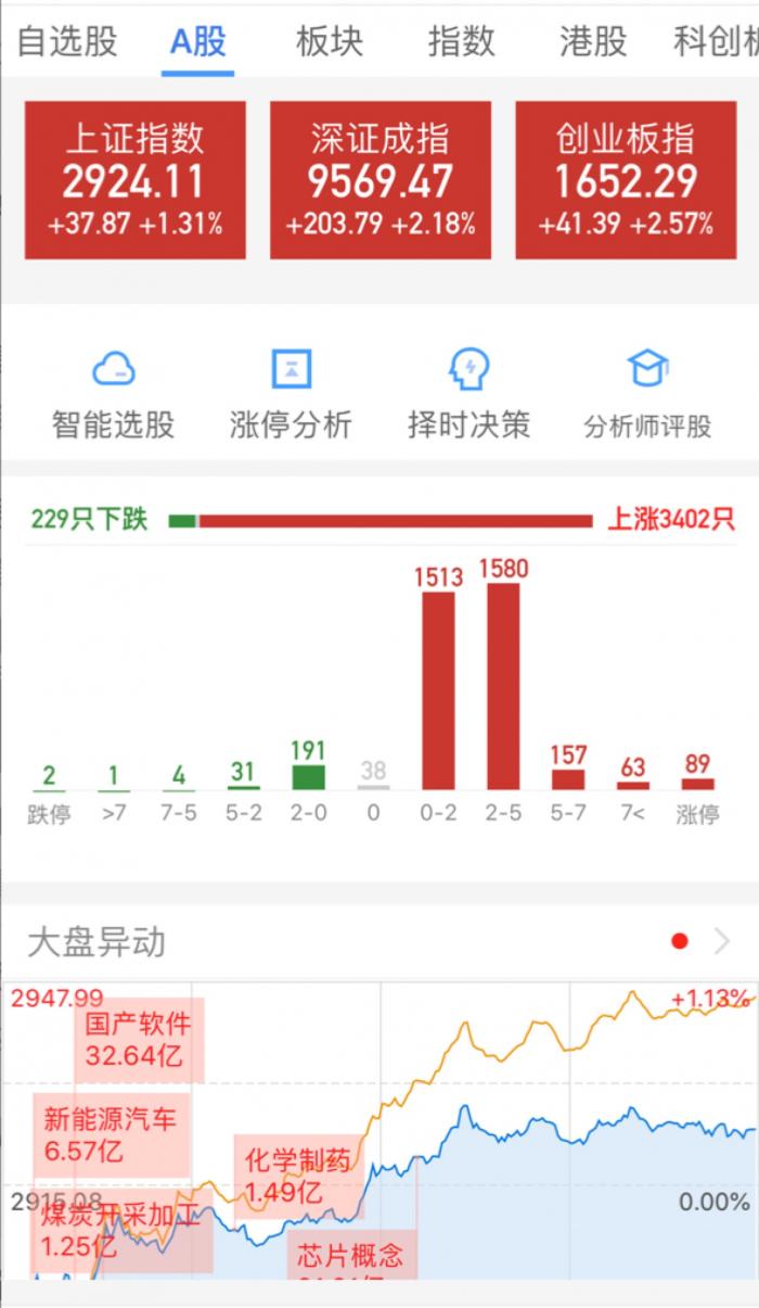 截至收盘,上证综指上涨1.31%收报2924.11点;深证成指上涨2.18%收报9569.47点;创业板指大涨2.57%收报1652.29点。
