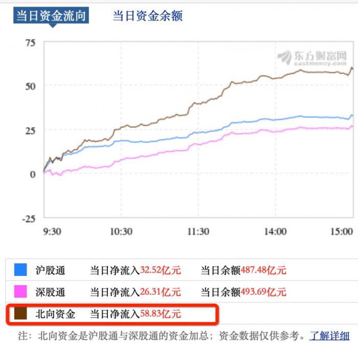当日,沪股通净流入A股32.52亿元,深股通净流入26.31亿元,北向资金合计净流入58.83亿元。