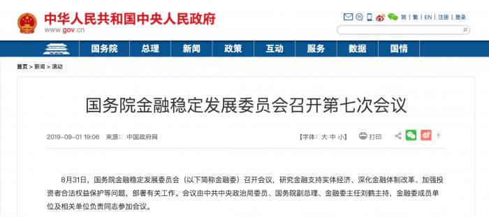 8月31日,国务院金融稳定发展委员会(以下简称金融委)召开第七次会议,研究金融支持实体经济、深化金融体制改革、加强投资者合法权益保护等问题,部署有关工作。会议由中共中央政治局委员、国务院副总理、金融委主任刘鹤主持,金融委成员单位及相关单位负责同志参加会议。