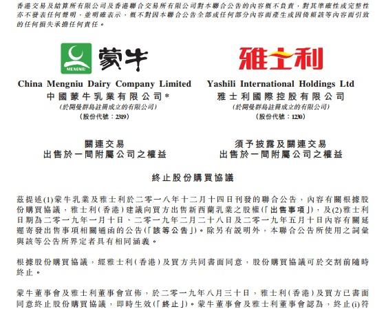 9月1日,蒙牛乳业(2319.HK)及雅士利国际(01230.HK)共同发布公告确认,今年8月30日,雅士利(香港)及买方已书面同意终止股份购买协议,即时生效。蒙牛及雅士利均未披露交易终止的具体原因,仅强调终止对蒙牛、雅士利、达能三方都不会带来影响。