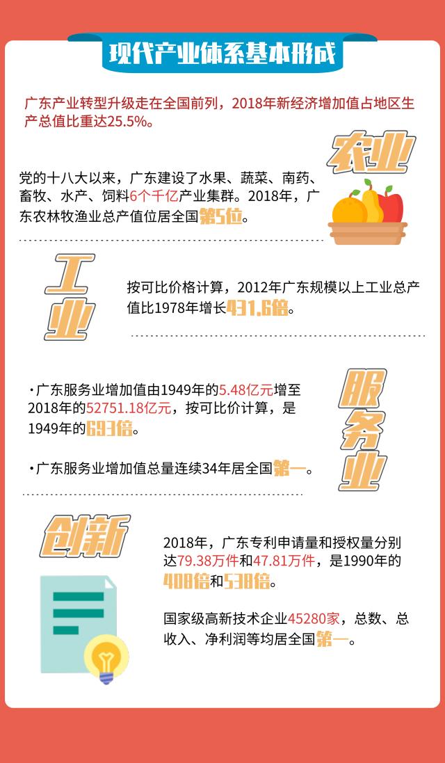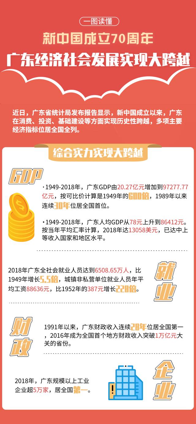 日前,省统计局发布数据显示,新中国成立70年来,广东多项主要经济指标位居全国第一或前列,实现跨越式发展,为全国经济发展提供重要支撑。