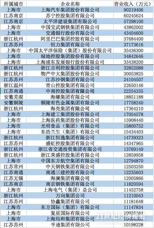 值得关注的是,在三省一市入围“千亿俱乐部企业”的企业榜单中,营业总收入排名前十的企业中,上海的企业就有6个,江苏共有3个,浙江仅有阿里巴巴集团入围。