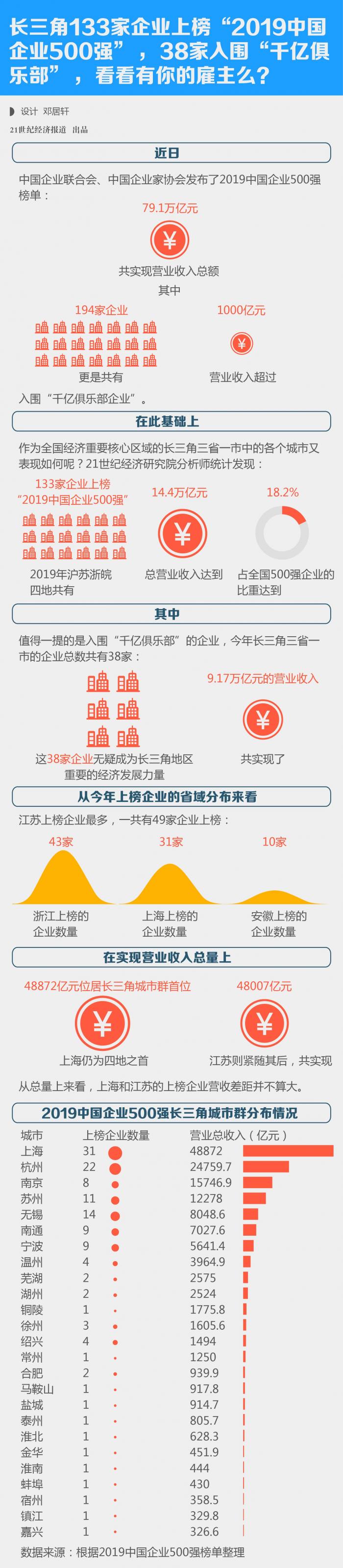 长三角133家企业上榜“2019中国企业500强” ,38家入围“千亿俱乐部” ,看看有你的雇主么?