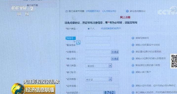 记者在小成参与投资的平台——甘肃文交影视中心官网上看到,该影视中心是甘肃文化产权交易中心下设部门,基本业务包括“影视衍生品的销售和服务”。记者注意到,投资者在注册开户时必须填写一个由宣发商提供的推荐号。