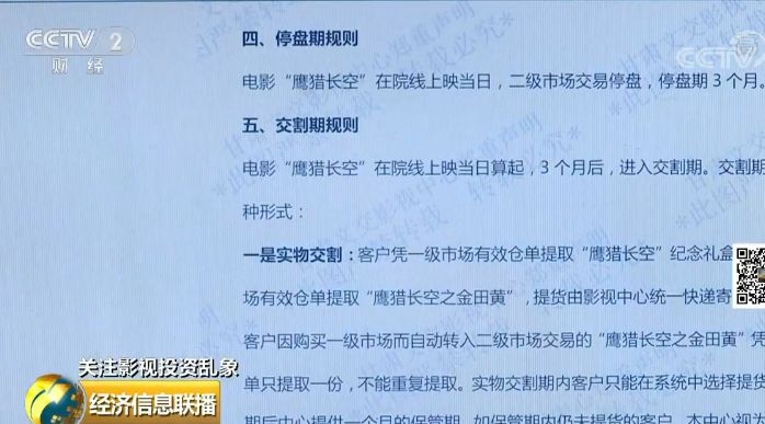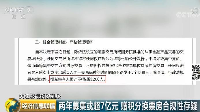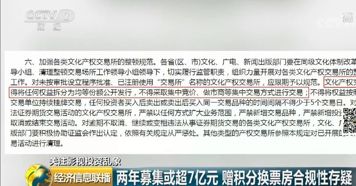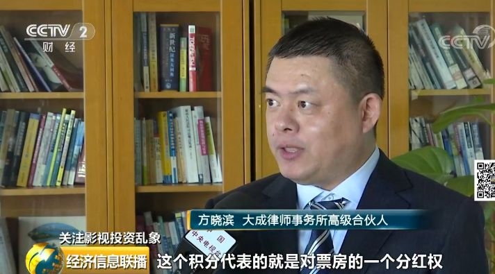 大成律师事务所高级合伙人 方晓滨:它所销售的影视衍生品,既包括实物,实际上还包括一种积分。这个积分代表的就是对票房的分红权,这个就是实打实的一个权益问题。作为任何交易场所都是不能够销售这样一个权益的。所以从这个角度讲,它是一个违规的行为,影视中心是没有办法撇清这种关系的。