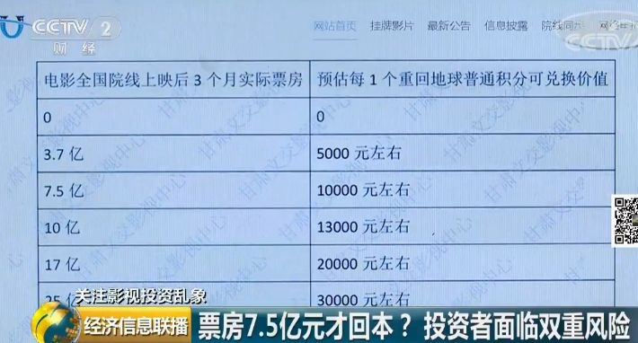 此外,平台上影视投资项目的设计对普通人来说本身风险就很大。按平台上对影片《重回地球》的票房分账预估,投资者花1万元获得1个普通积分,在电影上映后前3个月票房达到3.7亿元才可能兑换约5000元左右;如果票房为7.5亿元,可以兑换1万元左右。如不考虑纪念品礼盒价值,则意味着投资者需要电影票房超过7.5亿元才能回本。