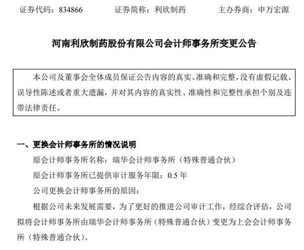 值得一提的是,在8月与瑞华解聘的公司中,利欣制药与瑞华的合作年限仅为半年。8月8日晚间,利欣制药发布会计师事务所变更公告。在更换会计师事务所的情况说明一项中,利欣制药表示,原会计师事务所瑞华已提供审计服务年限0.5年,公司更换会计师事务所的原因为:根据公司未来发展需要,为了更好地推进公司审计工作,经综合评估,公司拟将会计师事务所由瑞华会计师事务所(特殊普通合伙)变更为上会会计师事务所(特殊普通合伙)。