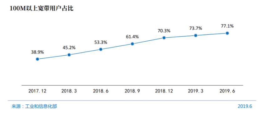 数据也显示,我国网民享受到越来越高的网速。截至2019年6月,100M以上宽带接入用户总数占互联网宽带接入用户总数的比例为77.1%,比2017年底的水平接近翻番。
